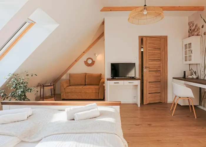 Die 95 m² große Ferienwohnung Lawendowe Rancho Szczytna liegt in 4 km Entfernung vom Kurpark und bietet einen privaten Autoparkplatz für alle, die mit dem Auto anreisen. Das Apartment liegt ungefähr 10 Autominuten vom Bären-Denkmal entfernt.